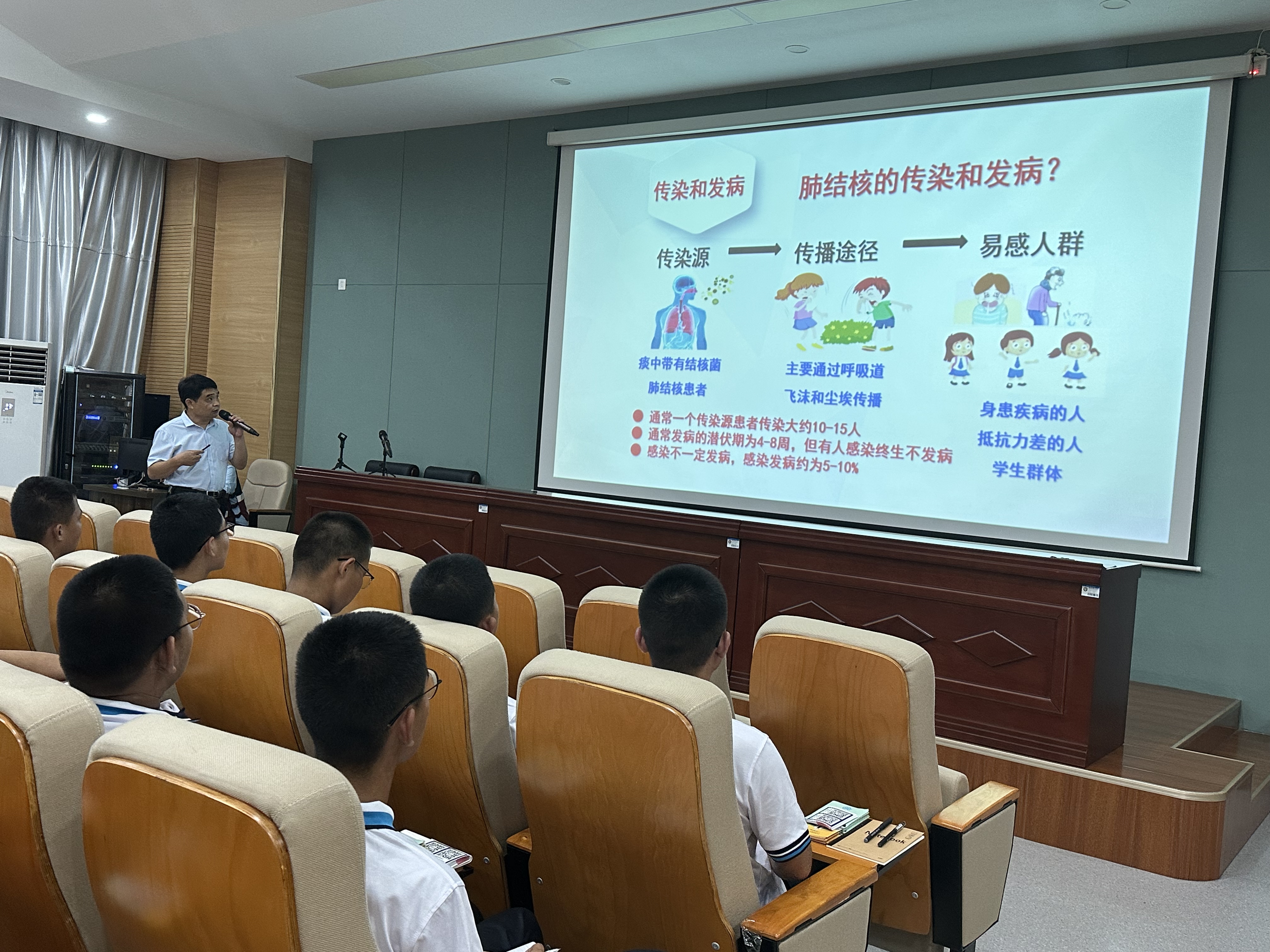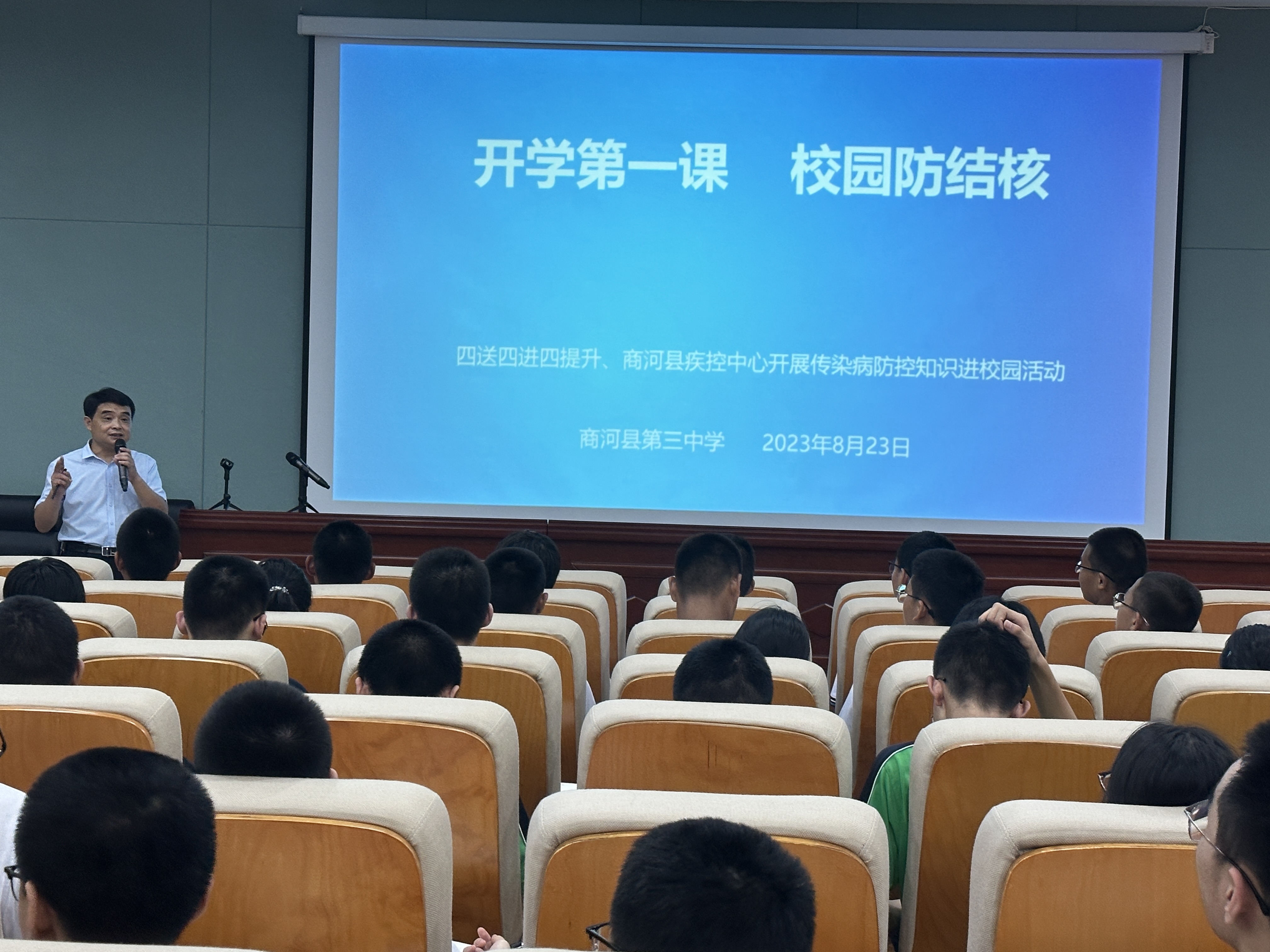 为提高师生对结核病的认识,增强自我保护意识,我中心于2023.8.23日秋季开学之际在商河县第三中学举办了结核病防控健康知识讲座,主要内容为结核病的相关常识以及学校教师、学生在学校结核病防控工作中所承担的职责和义务。为扩大宣传面,提高宣传效果,学校组织全校57个班级的班长现场参与。疾控中心工作人员就结核病相关知识,学校在日常工作中如何做好健康监测,因病缺勤登记以及发生学校疫情后如何规范进行处置等向学生进行了全面的讲解。