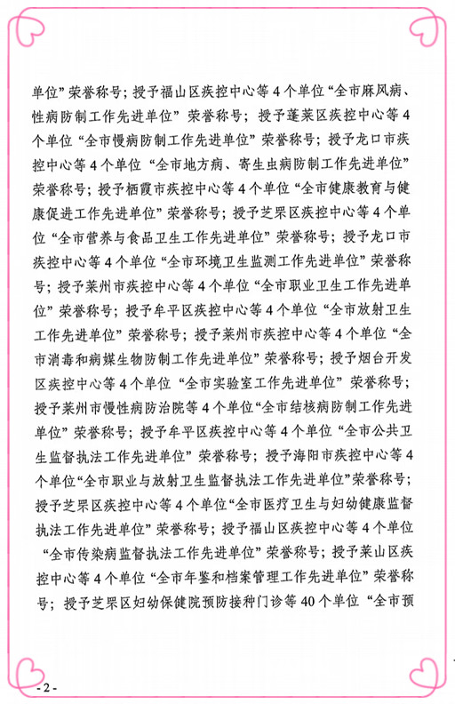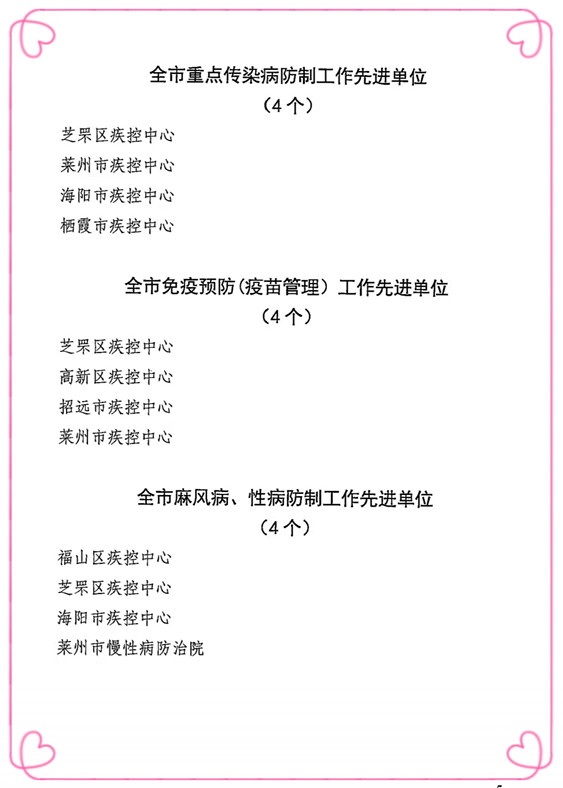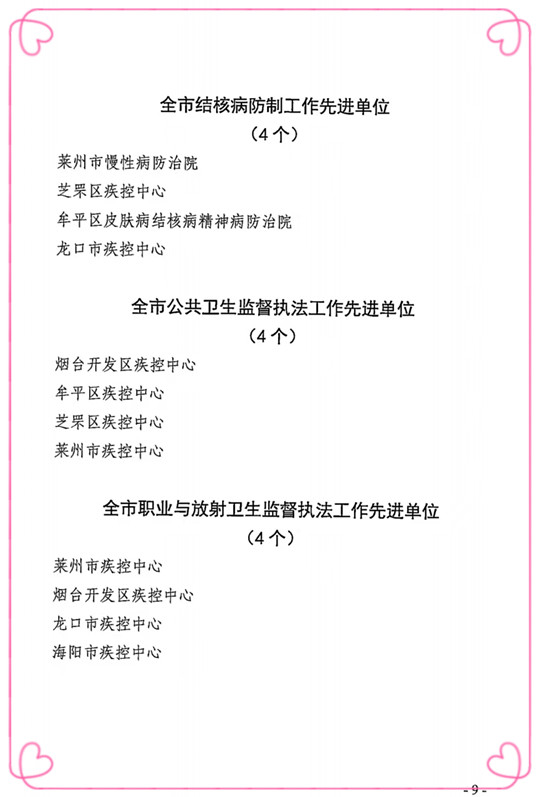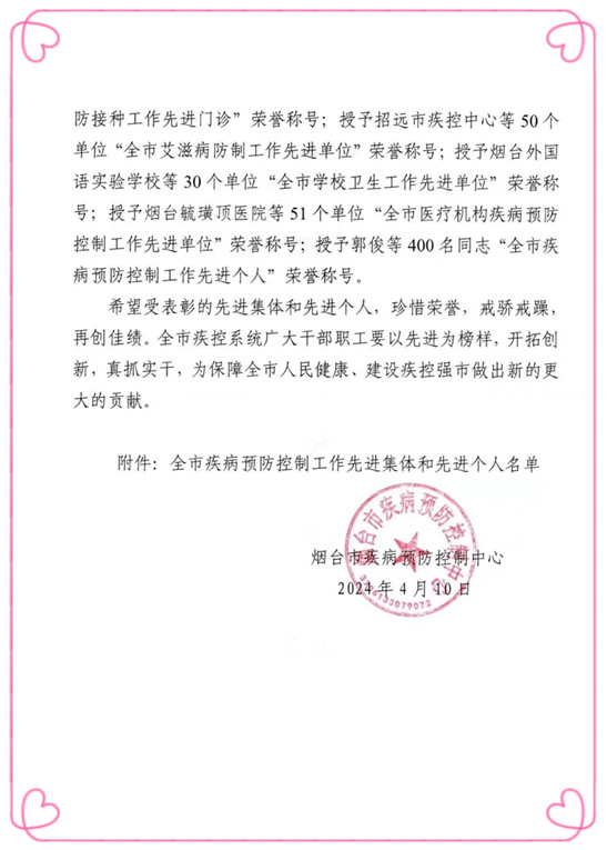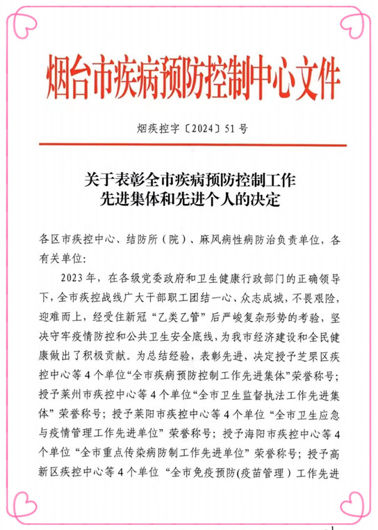 4月10日,烟台市疾病预防控制中心印发了烟疾控字【2024】51号文件《关于表彰全市疾病预防控制工作先进集体和先进个人的决定》,莱州市慢性病防治院以其出色的工作成绩荣获“2023年度全市结核病防制工作先进单位”、“2023年度全市麻风病、性病防制工作先进单位工作先进单位”荣誉称号。