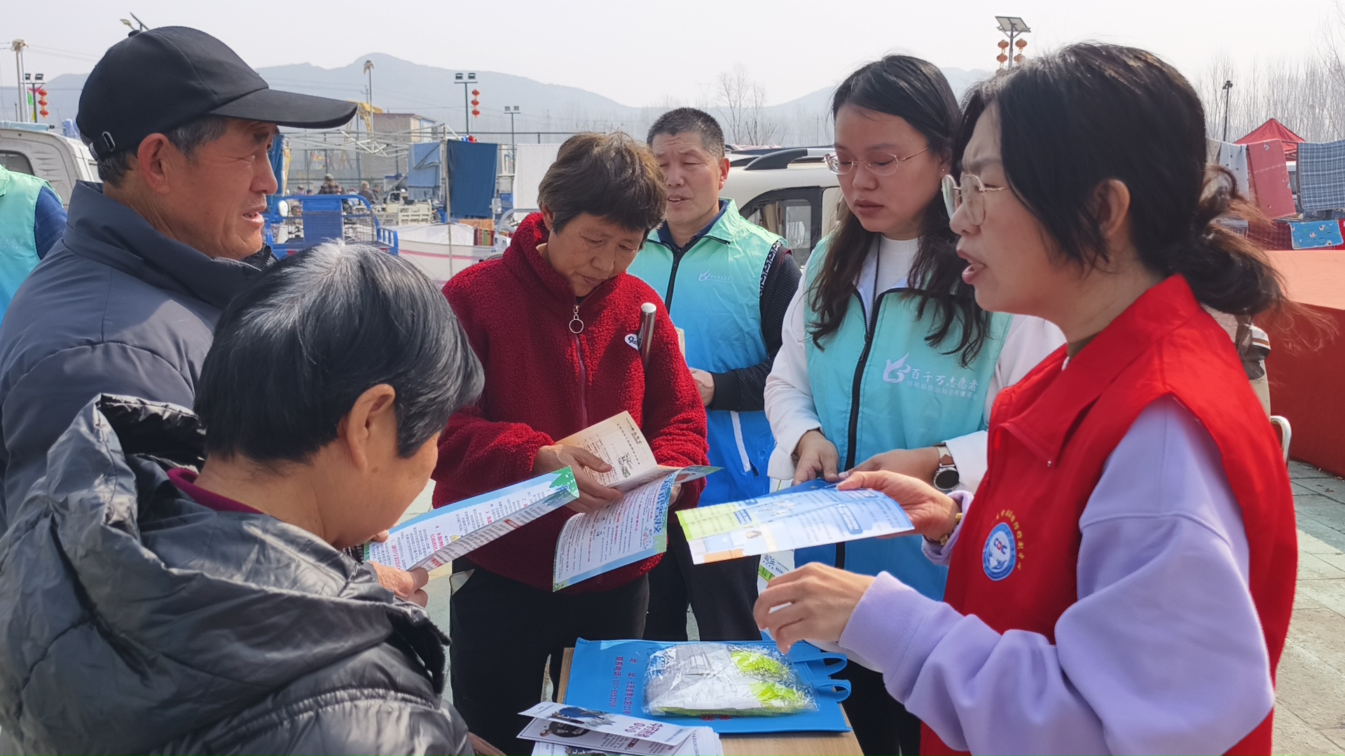 活动现场,百千万志愿者们早早便做好了充足准备。在集市显眼处搭建起的大舞台旁,整齐摆放着宣传桌椅,桌上堆满了各类结核病防治宣传资料。一条条醒目的宣传条幅高高悬挂,随风飘动,上面印着的结核病防治标语格外引人注目,瞬间营造出浓厚的宣传氛围,路过的人们纷纷被吸引,好奇心被充分勾起,这极大地增加了群众的参与感与记忆点。