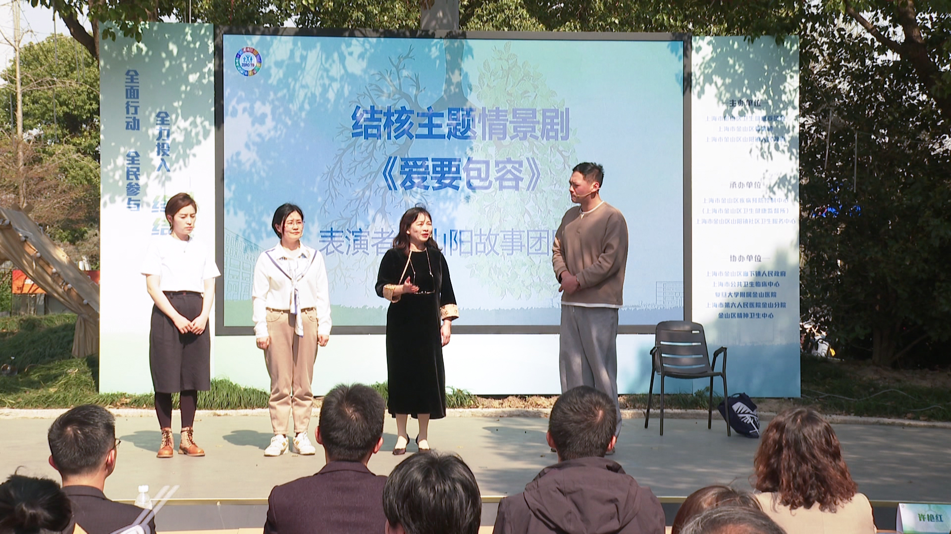 一年来,山阳故事团队创作出《老学究看病》、《后悔》、《小谭的秘密》和《张姐小果核逃记》四篇抗痨主题故事,故事内容丰富,涵盖预防、筛查、治疗、政府减免政策等。为满足不同人群宣传需要,山阳故事团队将每篇故事录制普通话和金山话两个版本,便于在外地年轻人和本地老年人中开展宣传;同时,该团队还发挥所长将故事改编成情景剧《爱要包容》,通过舞台将跌宕起伏的故事情节呈现给观众,让结核病防治知识在欢声笑语中得到更广泛的传播。