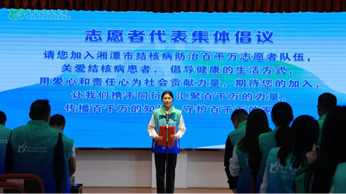 2024年10月29日,9所高校志愿者代表参加全市“提升行动”启动仪式活动,他们从与会领导手中郑重接过百千万志愿者队旗,“请您加入湘潭市结核病防治百千万志愿者队伍”的宣誓声响彻会场。这场采用“情景式启动”模式的仪式,将单向工作部署转变为多向经验交流。现场发布的《终结结核流行》宣传片以纪实手法再现志愿者深入社区、走进校园的服务场景,用画面传递知识,以情感凝聚力量。