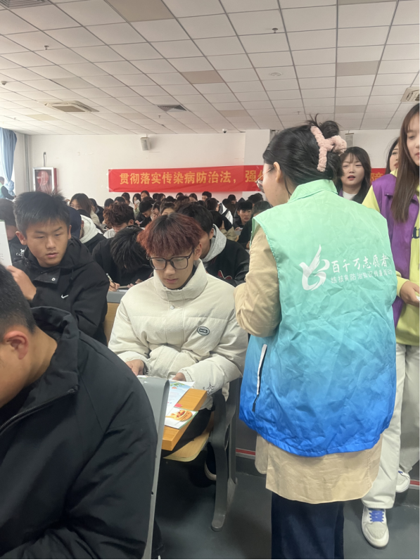 现场为学生们发放宣传页,纸抽,无纺布袋,笔等宣传品。 结核病的防治关系到每位学生的身体健康和社会正常的生活秩序。这次针对校园进行宣传,宣传氛围良好通过本次宣传活动,进一步提高了学生对结核病危害性和预防的认识,对推动传染病防控工作、减少结核病的传播起到了积极的作用。