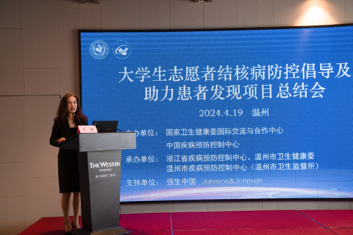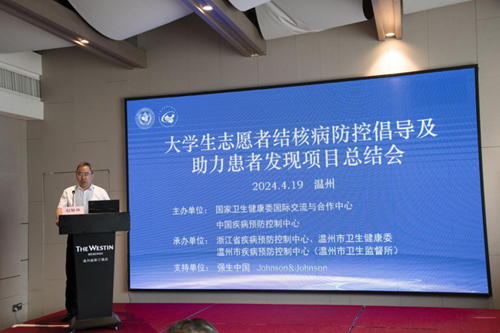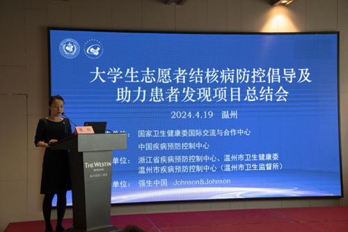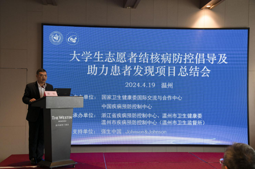 正值谷雨时节,春风和畅,气候宜人舒爽。2024年4月19日,大学生志愿者结核病防控倡导及助力患者发现项目(UVTB5+项目)总结会在山水之美的浙江省温州市举办,国家卫生健康委国际交流与合作中心副主任王健,中国疾控中心结核病预防控制中心主任赵雁林,浙江省卫生健康委国合处处长陈正方,浙江省疾病预防控制中心副主任蒋健敏,温州市卫生健康委党委委员、副主任、疾控局局长孙坚,西安杨森卫生政府事务与市场准入部负责人蔡颖,国家卫生健康委国际交流与合作中心外联部部长王蓓,国家卫生健康委国际交流与合作中心高级项目主管张晓燕,浙江省疾病预防控制中心结防所所长陈彬,四川省疾病预防控制中心结防所副所长夏岚,温州市卫生健康委疾控处处长潘江波,温州市疾病预防控制中心(温州市卫生监督所)党委书记、中心主任陈精益,温州市疾病预防控制中心(温州市卫生监督所)中心副主任林献丹,温州市疾病预防控制中心(温州市卫生监督所)结防所副所长赵丽娜等领导和专家出席开幕式,来自中国疾控中心结核病预防控制中心的工作团队,以及来自浙江和四川两省疾控中心专家、部分项目试点大学所在地(市)防治机构专家、部分项目试点大学专家和学生40余人参加了开幕式和总结会,开幕式由中国疾控中心结核病预防控制中心健康促进部主任屈燕主持。