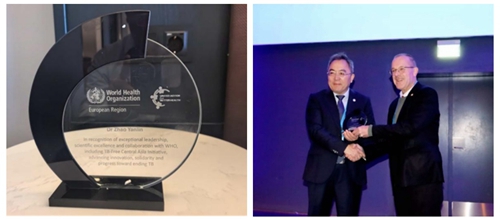 会议期间,国际防痨与肺部疾病联合会副主席暨世界卫生组织(WHO)欧洲区负责人汉斯·克鲁格(Dr. Hans Henri P. Kluge)代表会议组织方和WHO向赵雁林主任颁发了奖杯,表彰中国疾控中心结核病预防控制中心在全球无结核社区建设和实践中发挥的技术引领作用,以及在结核病科学研究领域与WHO合作所做的贡献。中国无结核社区建设的模式已经被中亚五国学习效仿。
