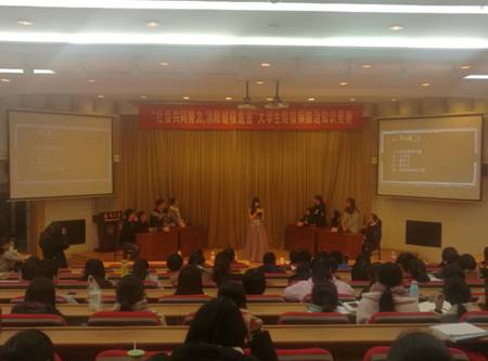 3月17日扬州市疾病预防控制中心、扬州市防痨协会、扬州大学生物科学与技术学院共同举办了扬州大学文汇路校区结核病知识竞赛。来自兽医学院、园植学院、医学院、生物科学与技术学院的八支队伍,经过前期初选后参加此次知识竞赛。知识竞赛涉及结核病的历史、传播途径、患病原因、防御方式、治疗手段、国家政策等多方面的问题。经过激烈而紧张的角逐,最后生物科学与技术学院的“马叉虫队”夺得桂冠。在此期间扬州大学学生社团同伴教育协会也响应号召开展了结核病宣传。3月20日下午对同伴协会会员和医学1503班进行肺结核知识的普及,在教室播放肺结核宣传片;24日中午在扬州大学淮海路校区分发防治肺结核宣传单并进行有关结核知识问答等。