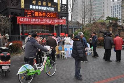 姜堰区卫计委、区医学会、区疾病预防控制中心、泰州市第二人民医院在坝口义茶亭广场进行结核病防治知识宣传
