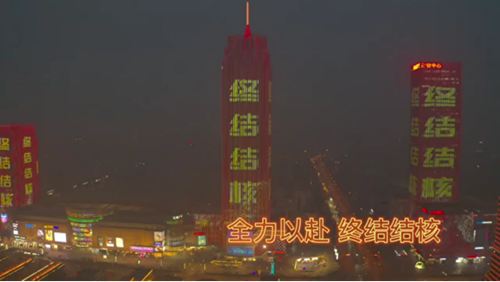 晚七时,夜幕降临,大楼通体亮红,滚动播放“终结结核”“End TB”“为结核病点亮城市的红”“light up for TB”等标语,瞬间引来大量路人驻足围观。今夜,这拔地而起的“红”由市中心向周边散发,照进每一位市民的心坎上,诠释着终结结核的强大决心,彰显着敬畏生命的无上力量,践行着守护健康的重大使命。