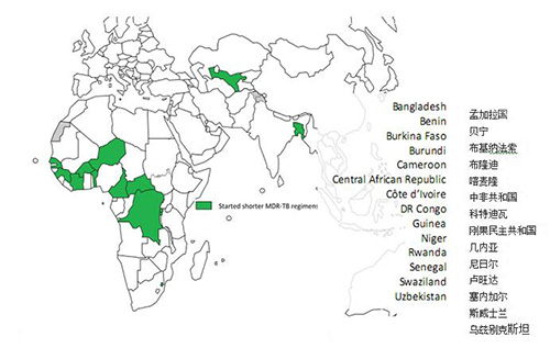 ●近日,一个持续时间小于12个月的标准化治疗方案正在被一些国家使用(见地图)。它已经在选定治疗的MDR-TB患者中显示出可喜的成果。