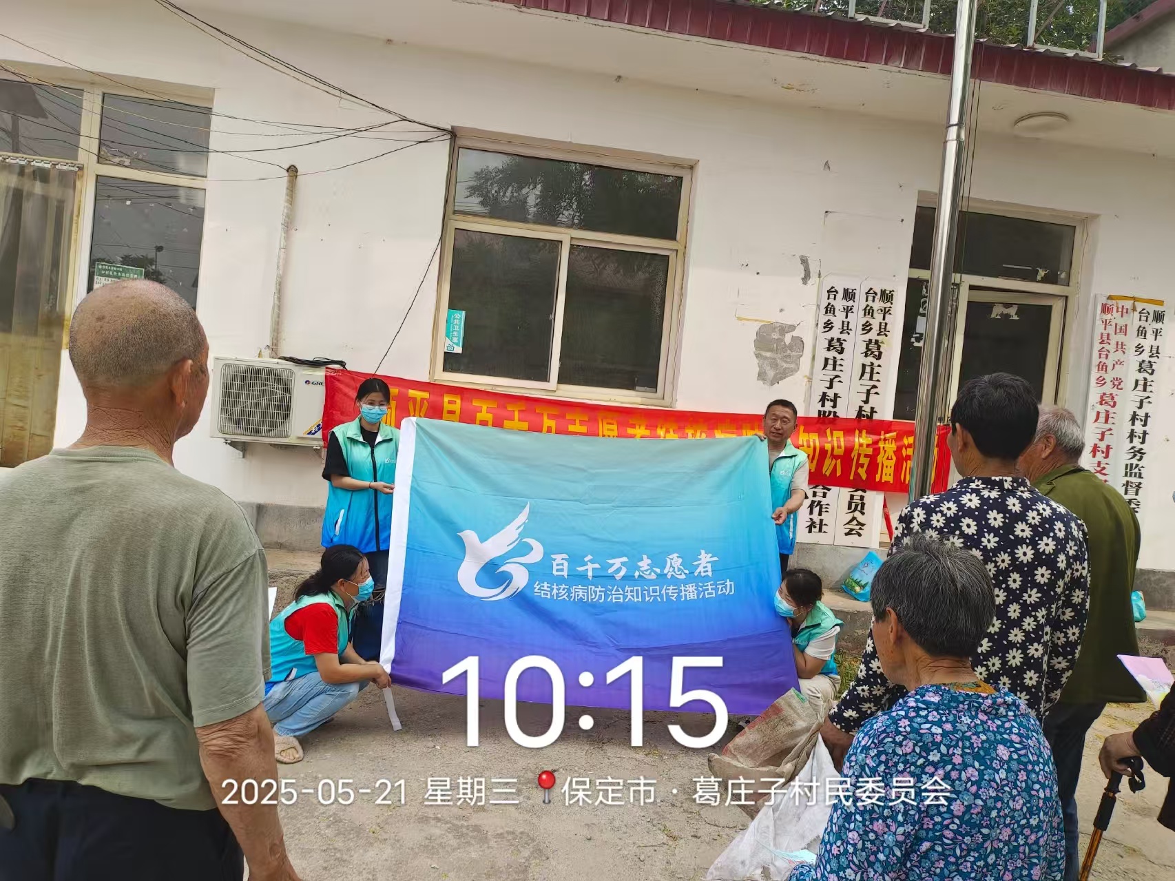 为深入推进结核病防治知识普及,提升农村居民健康防护意识,顺平县百千万志愿队于2025年5月21日走进葛庄子村,开展结核病防治宣传活动。活动通过多元化宣传形式,有效增强村民对结核病的认知。