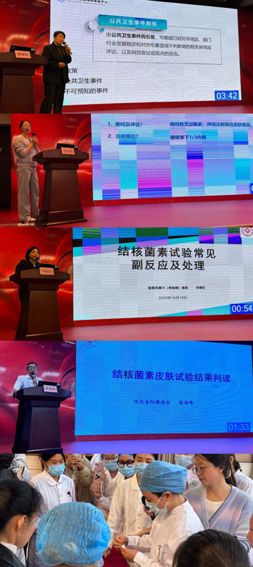廊坊市疾控中心党委书记李玉婵主持培训环节,河北省疾控中心樊利红主任结合近年学校结核病典型案例,详解疫情舆情应对策略,梳理结核菌素试验原理等基础知识,帮助学员建立“先懂理论再动手”的认知逻辑;廊坊市第三人民医院门诊办公室主任马凤英详细讲解了结核菌素皮肤试验操作规范并制作操作视频强调注意事项;邯郸市传染病医院副院长刘丽红介绍了结核菌素试验常见副反应及处理;河北省防痨协会副理事长陈海峰讲解了结核菌素试验结果判读;廊坊市第三人民医院内科护士长孙梦然进行了结核菌素试验操作现场示教。各位专家授课干货满满,培训全程高效有序。